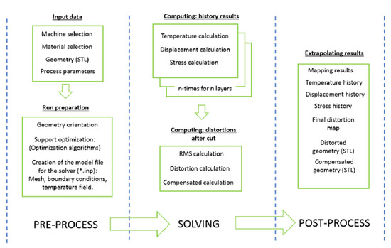 The analysis of the additive manufacturing process is performed with software developed in ITACAe, which determines the final distortions of the geometry, residual stress, and temperature distribution. The multi-step simulation is described in Table A1.