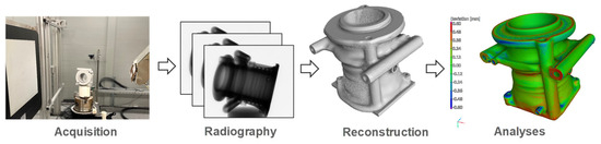 X-ray computed tomography (XCT) is a non-destructive imaging modality that facilitates comprehensive internal characterization of components, even those with complex geometrical configurations. In the domain of additive manufacturing, XCT stands as the quintessential method for internal quality assessments, allowing for detailed visualization and analysis of structural integrity and material discontinuities within fabricated parts [14,38]. It involves a sequence of steps starting with the acquiring projections; these projections are then processed through a reconstruction procedure, followed by measurements and/or defect detection. Further details of the underlying principles are outlined in reference [17,18].