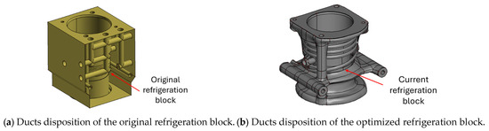 Figure 9 shows the main differences between the original and the optimized geometry. It is important to note that not only the disposition of the ducts has changed but also their cross-section, although their areas are the same: 57 mm2 for the original refrigeration block and 55.32 mm2 for the serpentine; hence, they are very similar. The volume of the cooling liquid in the original thermal block is 18,470 mm3, while the volume for the optimized serpentine is approximately 24,910 mm3.