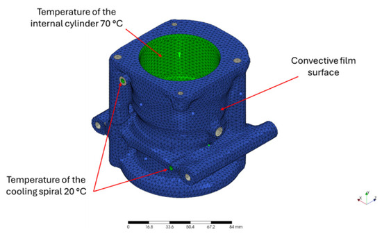 The thermal analysis of the refrigeration block is performed by FE (Figure 10) in order to define the differences between the previous refrigeration system and the one with the new design. It is assumed that, in both cases, the internal cylinder has a temperature of 70 °C, while the refrigeration ducts have a temperature of 20 °C.
