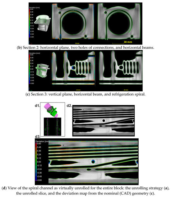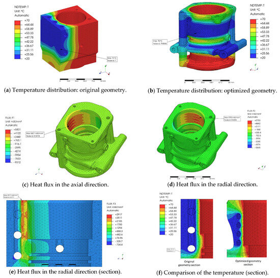 Figure 11c–e show that, on average, the heat flow in the radial direction is around 5000 (mW/mm2) for the optimized geometry, which is still more than double that of the original refrigeration block, which is 2917 (mW/mm2). The maximum value of the radial heat flow of 9353 (mW/mm2) is also due to the presence of the pneumatic holes that go into the cylinder, which produce a higher gradient. The effects of the temperature distribution can be seen in Figure 11, where the section also shows that the optimized geometry present in the upper part is not sufficiently cooled, but the overcooling is greater in the new design.