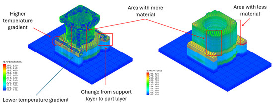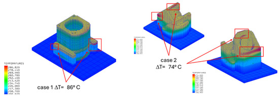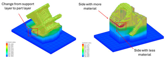 Figure 14 shows that for Case 1 (90° orientation), the corners have a higher gradient of temperature due to the change of the layer from support to part. Such a gradient remains for two of the four corners, even for successive layers, because there is less material in these corners, and the heat can only dissipate by radiation, which takes longer than dissipation by conduction through the materials.