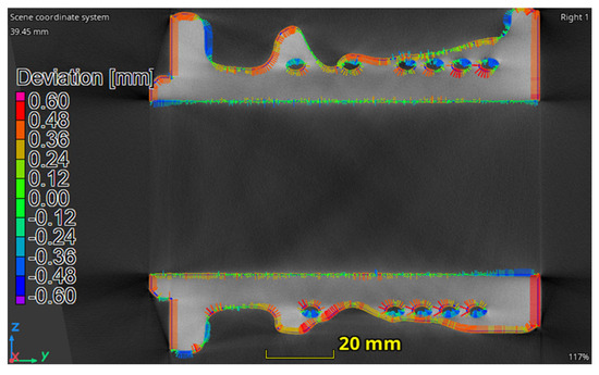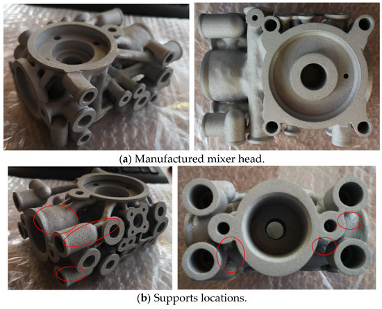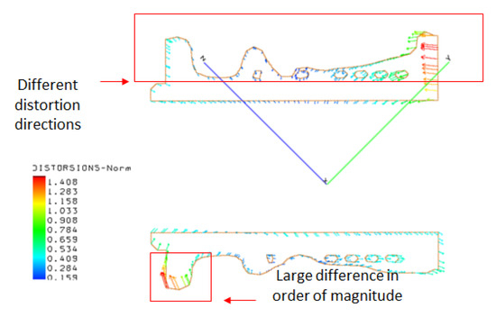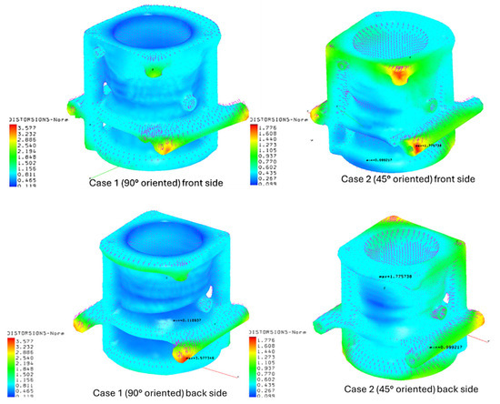Preliminary results can be obtained by the configuration of supports created, and Table 4 shows the differences between the two processes in terms of time, support volumes, and other characteristics that can be useful for the printer. The support volume for the second case increases by more than double, passing from 15,782 mm3 to 43,279 mm3, while the manufacturing time changes less significantly as follows: 24.4 h and 29.5 h for the first and second cases, respectively. The number of layers of the second case is 30% higher than the layers of the first case; however, the last layers of the second case have a smaller area. Another aspect of such an assessment is the support dimensions and geometry; the average areas of the support in the second case are higher, and this can change how the thermal distribution will affect the final distortions of the part.
