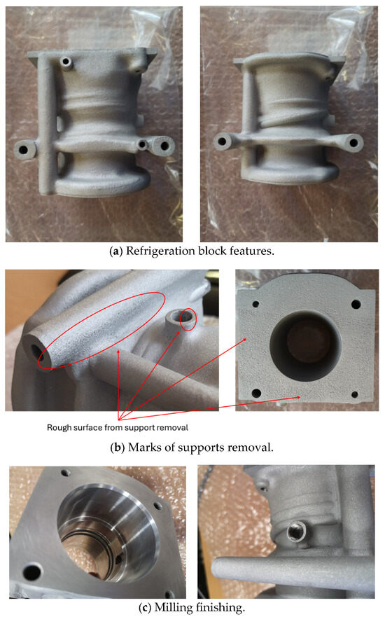 Prior to the manufacturing phase, the topology optimization geometry is further assessed to determine the displacements and stresses expected during in-service conditions. Furthermore, the thermal analysis demonstrates the efficiency of the new design compared with the previous one, while a simulation of the 3D printing process allows for the determination of the best printing conditions. Finally, the manufactured parts are presented in this section, as well as the measurements performed for the refrigeration block.