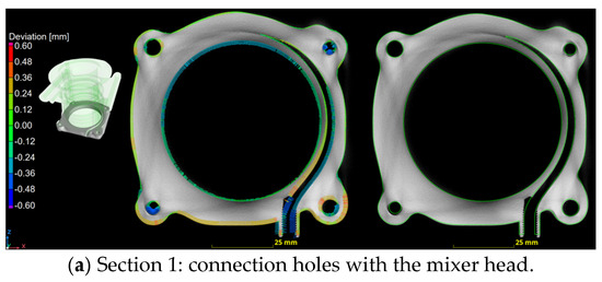 In this case, it was decided to have a layer of extra metal of 0.5 and 0.6 mm on some of the surfaces of the mixer head, as shown in Figure 7. The V2 mixer head has changed the position of the holes connecting the head to the above refrigeration block because they have shifted to allocate the cooling spiral. As for the rest of the geometry, the previously evaluated topology optimization is deemed valid; hence, no further changes were brought.