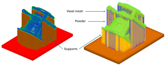 Once the manufacturing parameters are set, a voxel mesh can be created that includes the part, the supports, and the powder. Such mesh is then used for the FEM thermal analysis performed for each layer of the printing process.