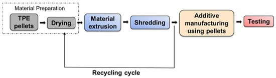 In this study, a PP grade and a TPE grade are processed and recycled using AM technology. A specific methodology is carried out, which will be explored in more detail in the following sections, and it consists of drying the material, shredding, filament extrusion, and AM. Manufacturing a specimen following this methodology is considered as a single recycling cycle, and recycling is performed up to five times. For this research, the source material is obtained in pellet form instead of plastic waste. This is conducted to ensure that there are standard reference values to compare the results after each recycling cycle. To better understand and investigate the degrading behavior of the polymers, it is also beneficial to know the properties of the source material. The pellets are used to make a filament or to directly manufacture components. Then recycling is performed according to the methodology.