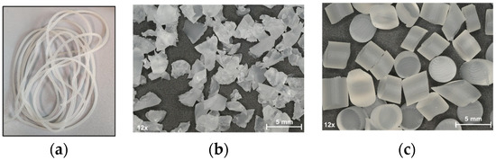 (a) Extruded, (b) shredded, and (c) manually cut TPE material.