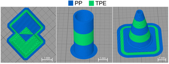 In addition to polymer recycling, the aim of this study is to manufacture hybrid components based on PP and TPE. As mentioned earlier, the manufacturer of the TPE pellets already indicated that the provided pellets have bonding properties with different polymers, including PP. To achieve a multi-material part, an AM process based on extrusion was used. This technology helps to create complex and functional components to obtain unique combinations of properties from the materials used. In this case, the AM printer used was the NX pro dual from the manufacturer Tumaker from Valencia, Spain, which has two separate extruders for material deposition. The most important factor when seeking to manufacture a hybrid component was to calibrate the height of the extruder nozzle so that it is equally aligned for both extruders and to calibrate the offset between both extruders. To select and to optimize the printing parameters, the slicing software Simplify3D (version 4.1.2) was used.