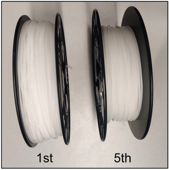 The possible cause for the irregular cross-section is non-uniform cooling. The fan blows the air into the extruded material from the sides only. Therefore, the cooling is not radially uniform. Moreover, as shown, the sensor detects the filament thickness only for the sides and thus the reading of the monitoring system varies slightly from the actual cross-section diameter. However, it was observed in the subsequent AM step that these results of the filament with a tolerance of ± 0.01 mm were still under the accuracy limit of the 3D-printer. The filament turns a little darker after every recycling cycle, possibly because of repeated thermal reprocessing. Air bubbles were not observed even after the 5th extrusion cycle. However, to avoid contamination of the produced filaments, spools were stored in a dryer at 60 °C. PP filament spools for the 1st and 5th recycling cycle are shown in Figure 9.