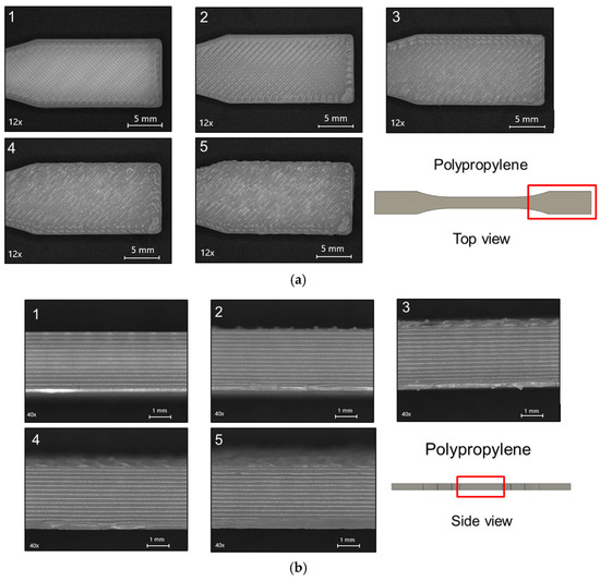 It was observed that, after recycling, the surface quality of the specimens slightly decreases, mainly because of the instability in the flow rate. In a study by Spoerk et al., similar behavior for PP blends was observed, where 15 extrusion tests were carried out to produce filaments, and the quality of the part after the 15th extrusion cycle was poor because of filament ovalities [14]. Thus, the slight visual deficiencies observed in the case of PP are the result of over-extrusion because of flow rate instabilities. In Figure 10, the optical results for PP are presented, where the tensile test specimens are observed from the top and side view after each recycling cycle. The numbers on the top left side denote the recycling cycle.