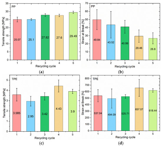(a) Tensile strength, (b) strain at break vs. recycling cycle of PP, (c) tensile strength, and (d) strain at break vs. recycling cycle of TPE at room temperature.