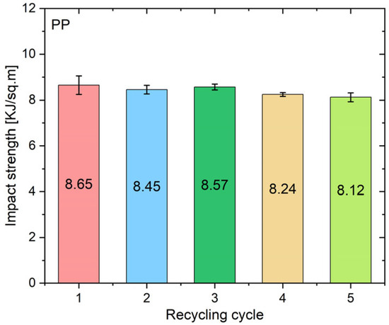 In addition, to evaluate the impact properties, the Charpy impact notch test was measured for PP. Interestingly, it was observed that PP exhibited a consistent and stable behavior in terms of impact resistance across multiple recycling cycles, with 8.65 , 8.45 , 8.57 , 8.24 , and 8.12 for the first to the fifth recycling cycle, respectively, as shown in Figure 15.