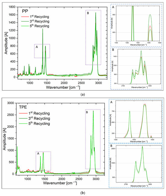 Fourier transformation infrared spectroscopy was conducted to obtain the composition and to identify any potential degradation during recycling. To minimize the risk of moisture-related artifacts in the FTIR spectra and to ensure accurate characterization of the material, before FTIR analysis, the specimens were dried in a vacuum oven at 50 °C for a minimum of 24 h. Figure 18 presents the FTIR spectra of PP and TPE samples for the first, third, and fifth recycling cycles. These spectra provide valuable information about the molecular modes and functional groups present in the material. It is possible to evaluate any changes or modifications of the chemical composition of the samples during the process of recycling. Typically, significant material degradation or compositional changes during recycling are reflected in the FTIR spectra through characteristic alterations. These may include a reduction in the intensity of fundamental absorption bands or the formation of new absorption bands.