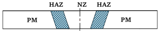 Cross-sectional area of the weldment showing the heat-affected zone (HAZ), nugget zone (NZ), and parent material (PM). Hardness measurements were taken at 1 mm intervals across these regions.
