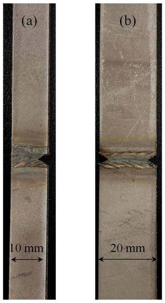 In this stage, two distinct notch geometries, (i) single-edge and (ii) double-sided V-shaped notch were selected. Subsequently, the specimens with chosen notch designs were fabricated. The notches were skilfully created in the weld seam of the samples utilizing a wire cut technique, with the angle of the V-shaped notches set precisely at 60 degrees. For visual reference, refer to Figure 2, which depicts the samples featuring both the single-edge and double-sided V-shaped notches in the welded joints. Elastic–plastic corrections were applied using Neuber’s rule (Equation (3)) to account for stress concentration at notches.