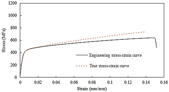 The obtained engineering and true stress–strain curves, along with the mechanical properties of the welded Inconel 600 alloy, are shown in Figure 5 and Table 2.