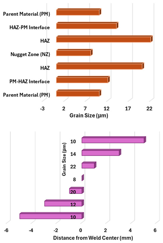 The average grain size was measured using the Heyn intercept method (ASTM E112-13 [32]) on optical micrographs. The results show significant grain coarsening in the HAZ compared to the PM and NZ. HAZ grain size (25 µm) is 2.5× larger than the NZ (8 µm), as shown in Table 4.