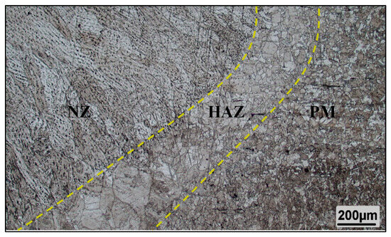The HAZ’s lower hardness correlates with its coarser grain structure, as predicted by the Hall–Petch relationship. Furthermore, the HAZ’s lower hardness (≈180 HV) compared to NZ (≈220 HV) aligns with its coarser grain structure (25 µm vs. 8 µm), as predicted by the Hall–Petch relationship. Figure 7 depicts the distinct microstructures of all welded regions.