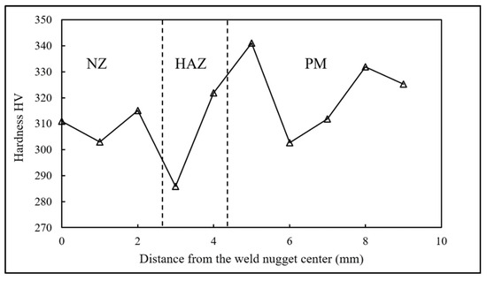 As seen in Figure 11, the hardness value in the HAZ is less than those in fusion zone (nugget) and PM.
