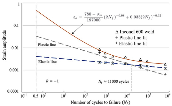 Strain-based fatigue parameters of Inconel 600 weldment. The strain–life curve was calibrated with Ramberg–Osgood exponent n′ = 0.135.