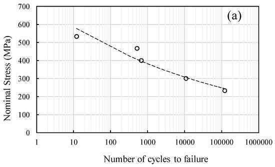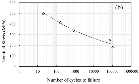 Figure 12 exhibits the comprehensive fatigue test data for the welded specimen, determining their respective fatigue responses under the applied loading conditions. All fatigue failures originated in the heat-affected zone (HAZ), as confirmed by fracture surface analysis.