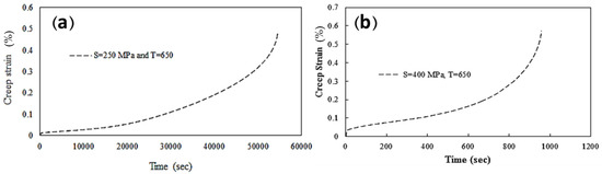 Creep strain versus time for welded sample at (a) S = 250 MPa and T = 650 °C, and (b) S = 400 MPa, and T = 650 °C. At 650 °C, specimens failed after 120 h at 400 MPa and 350 h at 250 MPa, which is consistent with stress-dependent creep life. Creep strain is reported as a percentage (e.g., 0.5% = 5 × 10−3 m/m).