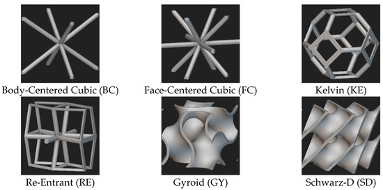 This study focuses on non-stochastic (periodic) structures, which are easier to design and control than their stochastic (random) counterparts [29]. The need to remove powder from the pores of printed structures limited this study to examining open-cell structures. Based on the above considerations, 5 truss-based and 3 triply periodic minimal surface (TPMS) cell designs were initially considered: Simple Cubic (SC), Kelvin (KE), Face-Centered Cubic (FC), Body-Centered Cubic (BC), Re-Entrant (RE), Gyroid (GY), Schwarz-D (SD) and Schwarz-P (SP) (nTop software, nTopology 4.21.2, Inc. New York, NY, USA). Among the truss-based lattices, SC structures present the highest strain sensitivity and anisotropy [59], which is not adequate for PPE, where impacts are multi-directional. Among the TPMS lattices, SP structures exhibit a greater anisotropy than the other TPMS structures [60], thus also making SP less well suited for applications requiring high stiffness and strength in multiple directions [35]. For the above reasons, the SC and SP lattice structures were discarded, while the following six structures were retained for further analysis (Figure 2): Kelvin (KE), Face-Centered Cubic (FC), Body-Centered Cubic (BC), Re-Entrant (RE), Gyroid (GY) and Schwarz-D (SD).