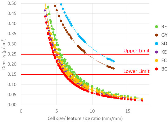 These parameters were specifically chosen to ensure that the lattice structures could emulate the properties of polymer foams commonly used in PPE. It can be observed in Figure 3 that the function that relates the relative density with the cell size/feature size ratio follows a power law and allows to calculate the feature size of a selected lattice structure of a given density and with a known cell size. For example, to reach a density of 0.15 g/cm3 (lower limit of this study) in the BC structures using the smallest cell size of 10 × 10 × 10 (mm), the cell size/feature size ratio must be equal to 6.0, which requires a feature size of ~1.67 mm, which is within the recommended 1–3 mm range of printable features [50].