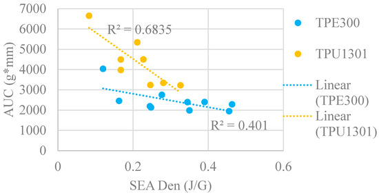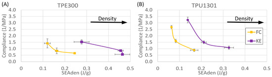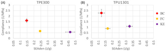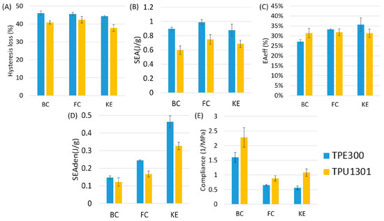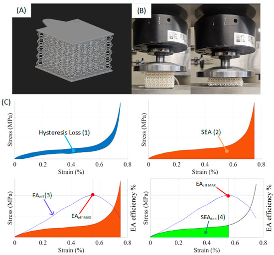 It is also possible to extract other indicators that could be used to define the energy absorption qualities of a structure. The next indicator is the specific energy absorption (SEA), which represents the energy absorbed (work) by a sample during loading divided by its mass (usually in J/g) [71,72]. To calculate SEA (2), the entire loading stress–strain diagram σ(ε) is integrated and divided by the relative density of a sample (ρ) (Figure 4C). This indicator is especially useful in applications where the mass is a limiting factor.