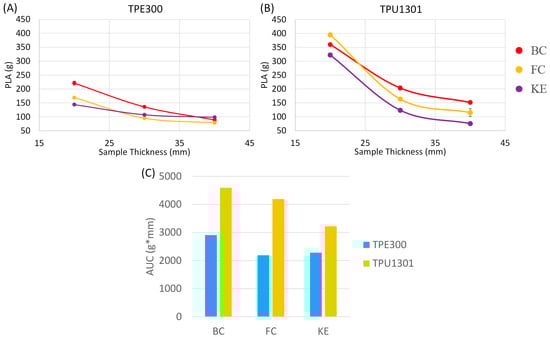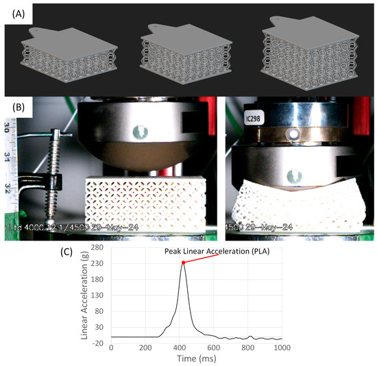 For dynamic testing, the peak linear acceleration (PLA) and the pulse length are the two main energy absorption indicators for dynamic tests. The lower the value of PLA and the longer the pulse length, the greater the user protection. In this work, PLA (Figure 5C) is considered as the direct target value for the protection level of an architecture structure, and it was measured by a uniaxial accelerometer installed inside the impactor of a Cadex monorail impact machine (Cadex Inc, Saint-Jean-Sur-Richelieu, QC, Canada). The mass of the carriage assembly was 5 kg, and it is representative of the mass of an average human head [75].