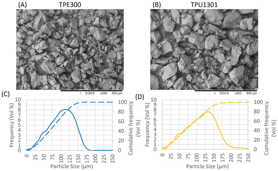SEM micrographs: (A) TPE300 and (B) TPU1301 powders at 200× magnification and particle size distribution for (C) TPE300 and (D) TPU1301.