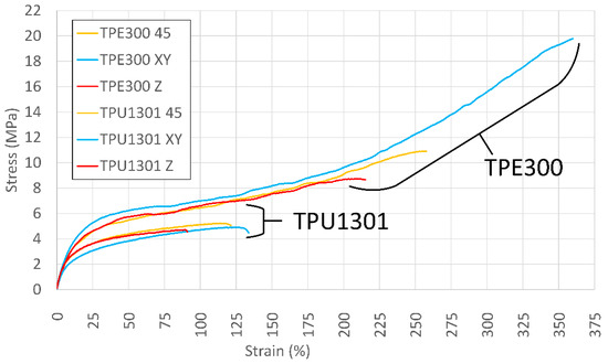 Typical tensile diagrams of the TPE300 and TPU1301 samples are presented in Figure 8 (tabulated data can be found in Table A3 in the Appendix A). Beyond yielding, the TPE300 samples show strain hardening without necking before the break, which can be associated with the alignment of polymer chains within the structure, something typically seen in rubbery amorphous polymers [5]. For both polymers, the mechanical properties present significant anisotropy, especially in terms of the maximum stress and elongation to failure. As ordinarily seen in LPBF, the mechanical properties in the Z direction are lower than those in the XY direction [11,78]. The stress–strain diagrams corresponding to the 45° direction are close to the former case, but with slightly higher maximum stress and strain values. Overall, the TPE300 samples are significantly more resistant and support much larger strains to failure than their TPU1301 counterparts.
