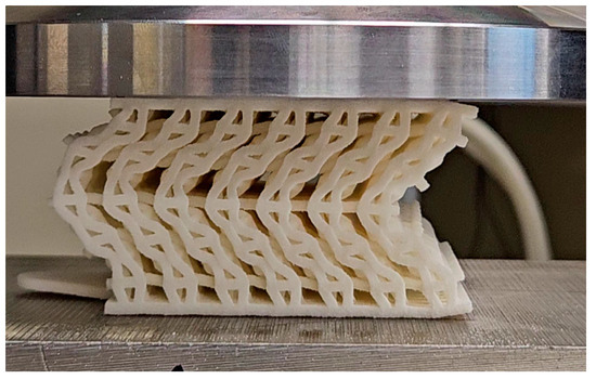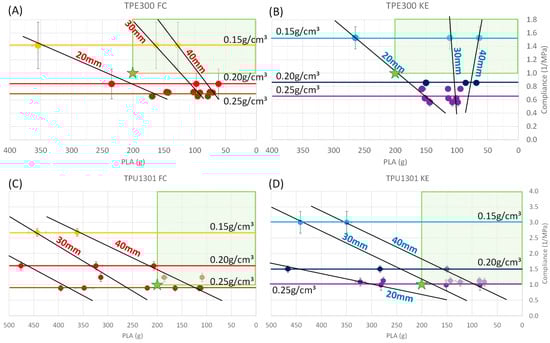 Traditionally, the Shore hardness is used to quantify the comfort level of foam-type materials. A lower Shore would correspond to a foam that has a higher wearer comfort level by offering a better pressure redistribution [25]. In the case of lattice structures, this measurement method would quantify the hardness of a bulk material and not of a lattice structure. Therefore, in this study, the Shore hardness was replaced by the reciprocal of the elastic modulus of a structure, i.e., by its compliance (in MPa−1). The compliance should be maximized to improve wearer comfort.