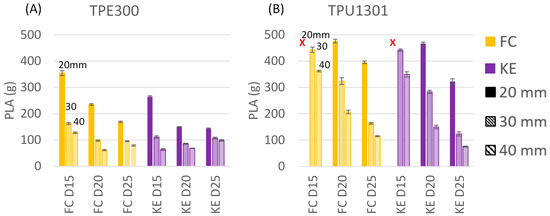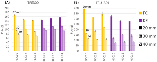 Overall, TPE300 samples were significantly harder than their TPU1301 counterparts. Specifically, the measured hardness for TPE300 was 91.6 ± 0.4 Shore A, which represents a −0.5% difference with the 92A value provided by the manufacturer. The measured hardness for TPU1301 was 78.4 ± 0.9 Shore A, representing a −8.8% difference with the 86A hardness indicated by the manufacturer.