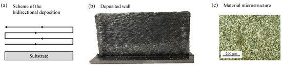 Deposition details, (a) scheme of the bidirectional deposition, (b) deposited wall, and (c) material microstructure.