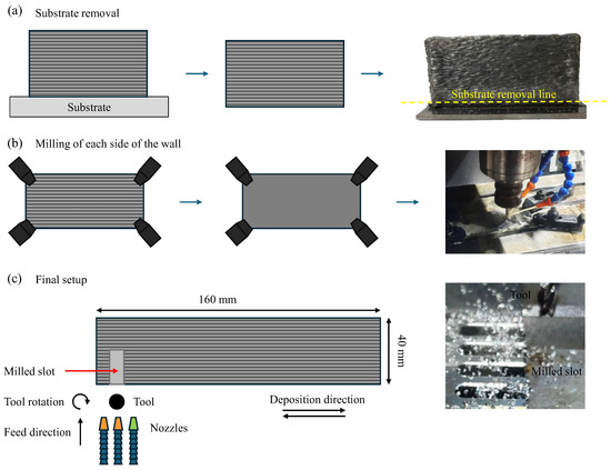 After deposition, the resulting wall had raw maximum dimensions of 85 mm in height, 7 mm in width, and 160 mm in length. To appropriately evaluate the influence of the cutting fluid it was necessary to prepare the part for the machining trials, as shown in Figure 3. The first step was removal of the substrate, as shown in Figure 3a. According to Prajadhiana et al. [70], this step is critical to the final component distortion and should be considered during the research to properly reflect the real-word application. The second step was the milling of the surface, Figure 3b, and this step was essential as WAAM-CMT-deposited walls can present dimensional variation, with the middle section of the wall having a lower width [65]. After the processing, the final sample dimensions were 40 in mm height, 5 mm in width, and 160 in mm length, with a resulting surface roughness of Ra ~ 3 µm. Figure 3c contains the scheme of the deposited wall indicating the deposition and machining directions.