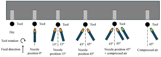 Considering that each nozzle could deliver a maximum of 10 L/min, the experimental design can be observed in Table 3. Compressed air (CA) was added to the flood method as an intermediate condition. Experiments with compressed air and dry cutting were also performed for comparison, as represented in Figure 4. The distance between the tip of the nozzles and the tool was maintained constant at 100 mm for all the configurations. This distance was selected due to the nozzle configuration on the CNC machine, to ensure consistent application angles. The cutting fluid was BIO 100e, manufactured by Biolub (Sorocaba, Brazil), which has a yellow-green visual aspect, a density of 1.065 g/cm3, a refractive index (MT 29) of 3.33, and a pH (3% in Water) of 9.5. It does not cause corrosion in Cast Iron Corrosion GG 25, 3% Solution (DIN 51.3560/2). This cutting fluid was selected for being biodegradable, enabling the use of flood while reducing the environmental impacts and treatment/disposal costs. It was diluted in water in a 1:10 ratio, as recommended by the manufacturer for flood. The air pressure on the compressed air nozzle was 0.6 MPa, resulting in an air flow rate of ~660 L/min.