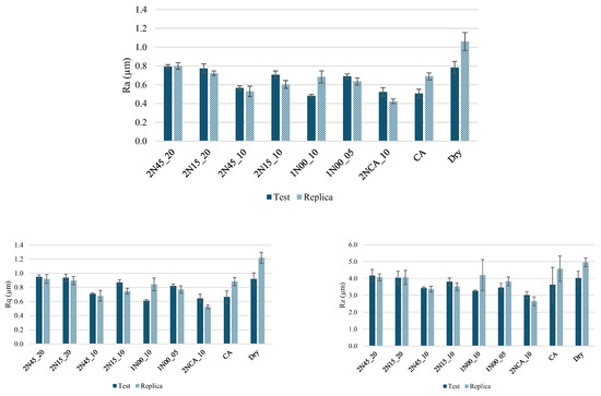 The roughness values for all the conditions evaluated can be observed in Figure 5. Regardless of the parameter observed, Ra, Rq, or Rz, it is possible to notice that the highest values were obtained for dry machining, which was expected: Ra = 1.06 µm for the replica. The higher flow rate, 20 L/min, presented the second (Ra = 0.80 µm) and third (Ra = 0.77 µm) highest values, for the positions of 45° and 15°, respectively, which agrees with the second hypothesis. Next, compressed air presented results comparable to 2NCA_10 and 1N00_10, where Ra equals to 0.51 µm, 0.48 µm, and 0.52 µm, respectively. The lowest value, Ra = 0.42 µm, was observed for the replica when machining with the combination of two nozzles and compressed air, which might be due to the compressed air enhancing the cutting fluid’s ability to reach the tool–chip interface, leading to better cooling–lubrication efficiency. The presence of compressed air could also improve the removal of chips from the cutting zone, avoiding chip recutting and contact with the machined surface.