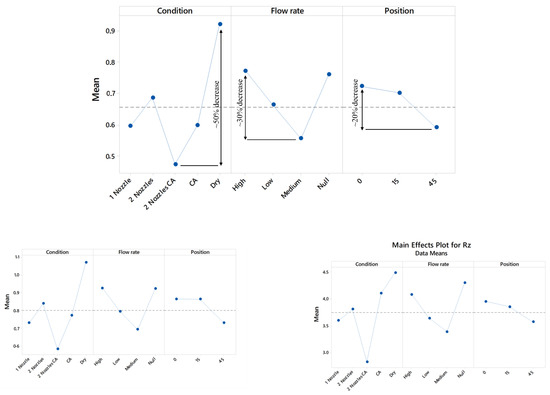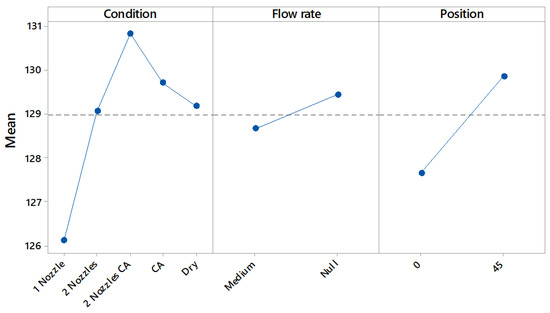 The nozzle position presented the least influence, as can be observed in Figure 6, since it only reduced the Ra by about 20% when using 45°. However, it was not statistically significant, with a p-value of 0.849; therefore, the reduction in Ra might be a result of the condition, since for two nozzles, for instance, it is not possible to position them at 0 degrees. Both the cutting condition and the flow rate were statistically significant factors affecting the roughness values.