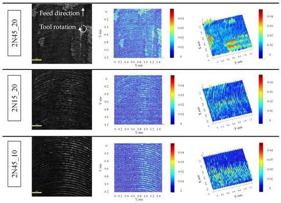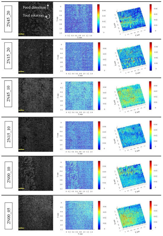 To better comprehend the milled surface, apart from the roughness values, it is also important to observe it through microscopy. Figure 7 and Figure 8 contain not only the microscopy view of the surfaces but also the treated images to enhance the visibility of surface details. It is worth mentioning that the color scale was normalized for a better comparison between different conditions and therefore the z axis (color scale) is representative rather than an absolute value. Overall, the surfaces presented well-defined feed marks and color variation, which might be associated with the variations in the microstructure caused by the deposition. Therefore, the tridimensional representation of peaks for the lighter surfaces might not be truly associated with a geometrical variation during the cut but rather with this microstructure variation.
