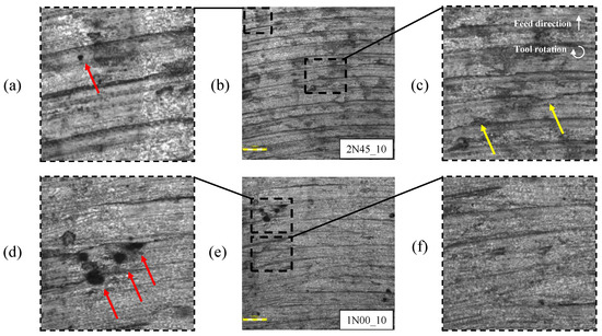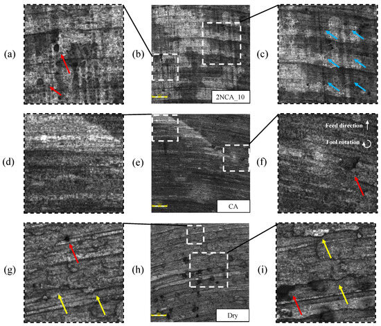 The cooling–lubrication conditions with a flow rate of 10 L/min or lower were selected for a more detailed analysis, since not only do they result in better surface quality, but they are also more environmentally friendly, requiring less or no cutting fluid. In Figure 9 and Figure 10, higher magnification images of the selected conditions (2N45_10, 1N00_10, 2NCA_10, CA, and Dry) can be observed, showing details of the machined surface. In Figure 9a,d red arrows indicate potential pores, which, according to Dekis et al. [68], might occur during the deposition and are usually associated with the parameters applied. Considering the tool path, the porosity indicated is likely formed during the deposition rather than as a result of material detachment during the milling.