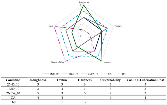 Therefore, evaluating distinct factors is essential when selecting a cooling–lubricant strategy for machining new materials. The overall impact on production must also be considered. In this context, Figure 12 presents a qualitative evaluation using a five-point scale, where five represents the highest (or most favorable) rating. The criteria “Roughness” and “Hardness” were based on the values presented in this study. The authors rated “Texture” qualitatively through microscopy, as detailed in Section 3.2.