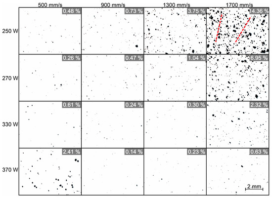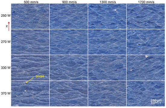 | Sample No. | Laser Power [W] | Scanning Speed [mm/s] | Energy Density, η [J/mm3] |