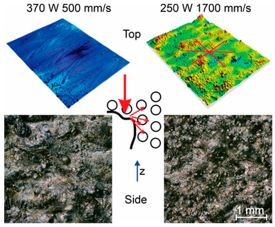 - The top surface roughness is, in general, three times lower than on the side surfaces, where a minimum Sa of 2.3 μm is achieved at 370 W and 500 mm/s for the top and 8.2 μm at 250 W 1300 mm/s on the side. With an increase in energy density, the roughness for top surfaces decreases, while for the side, it increases. Supplementary parameters of Sdq, Sku and Ssk can be used, to additionally describe the surface roughness and anisotropy.