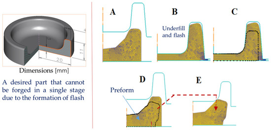 Illustration of point tracking in an FE model to obtain a preform. (A) A larger preform than what is desired, (B) forged part showing two defects, under fil and flash, (C) mapped points of the desired final geometry to be tracked, (D) tracked points to the initial larger preform geometry, and (E) preform shape for the desired final part geometry.