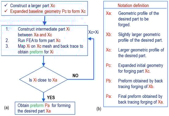 (a) FE simulation flow chart to obtain a preform, (b) definition of notations.