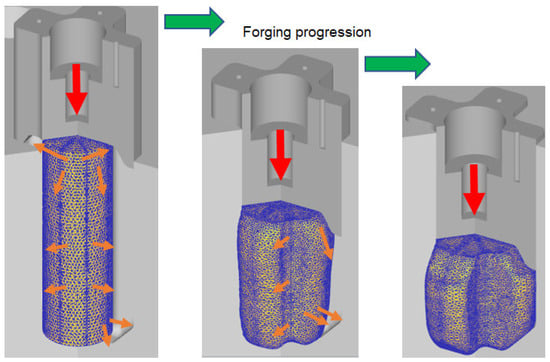 Material flow in 2D axisymmetric forging. The red arrows show the directions of the upper die.