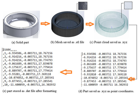 - The STL file is exported as an xyz file to generate a point cloud (Figure 7c).