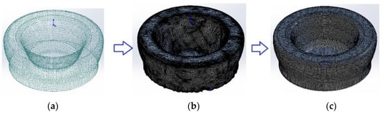 - The raw mesh may contain issues such as overlapping triangles or non-manifold edges. These are resolved using SpaceClaim, where the mesh is smoothed, repaired, and re-meshed (Figure 8c).
